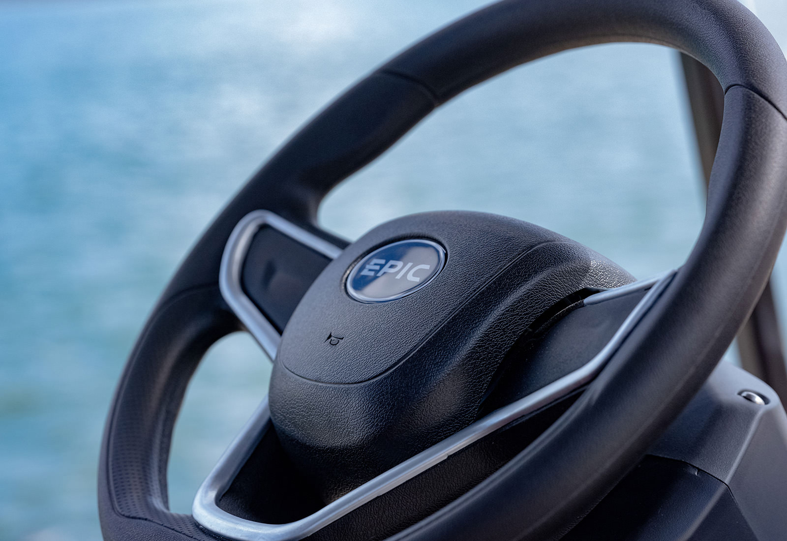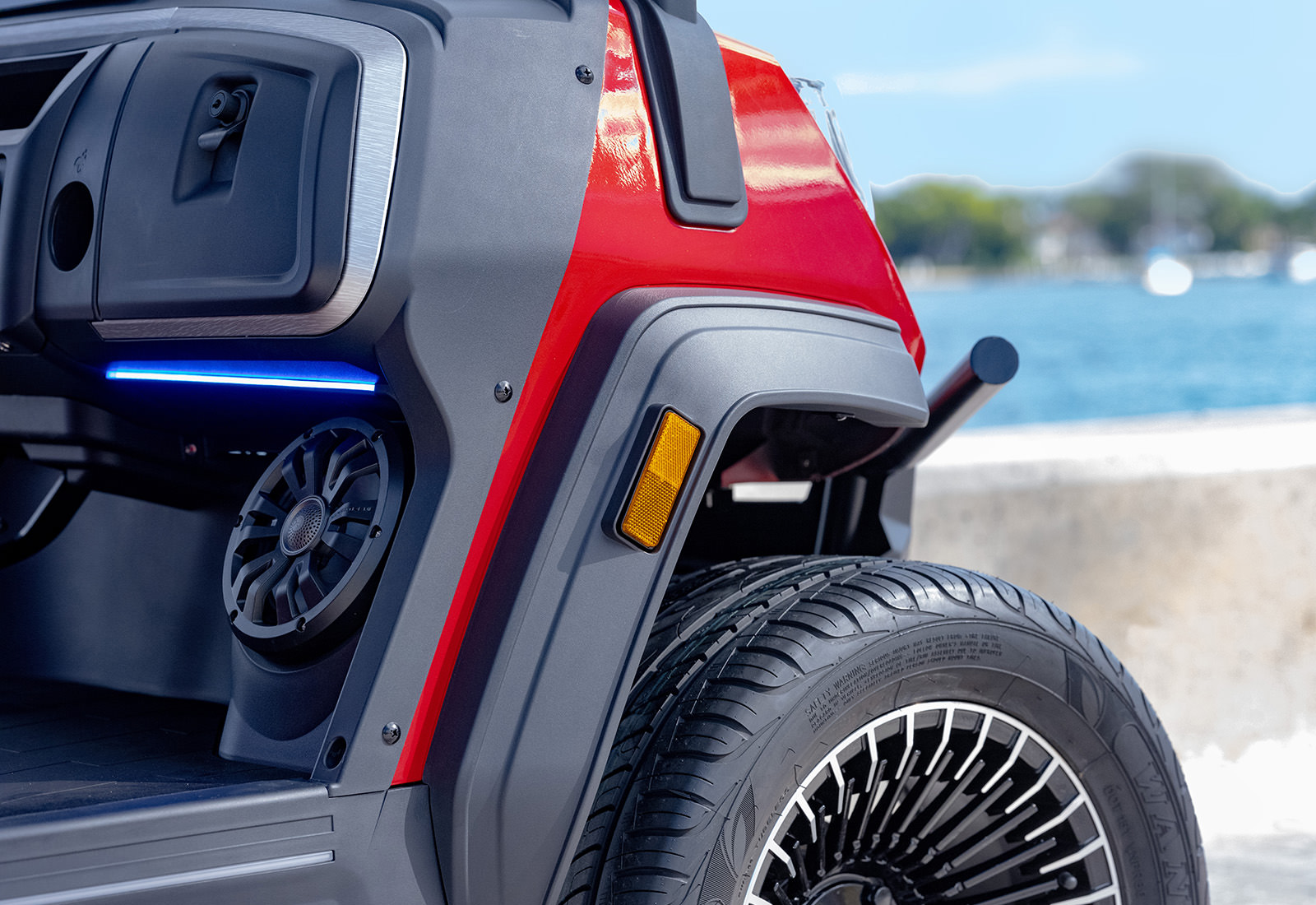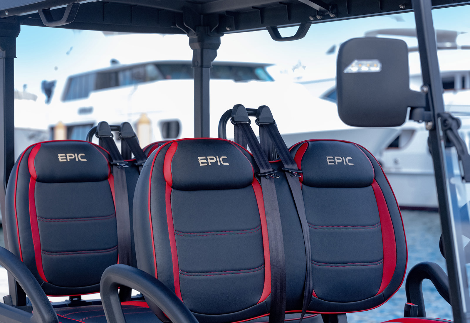 Furnished with every imaginable feature, the forward-facing four-seater Epic E40FX comes in six stylish colors and two height options. Premium 14” wheels and street-ready tires provide a solid foundation for every journey on every terrain, no matter what lift height is selected. With an abundance of storage, superior built-in marine-grade sound system and speakers, and stunning accent lighting, this Epic E40FX golf cart illuminates the possibilities for fun and adventure.