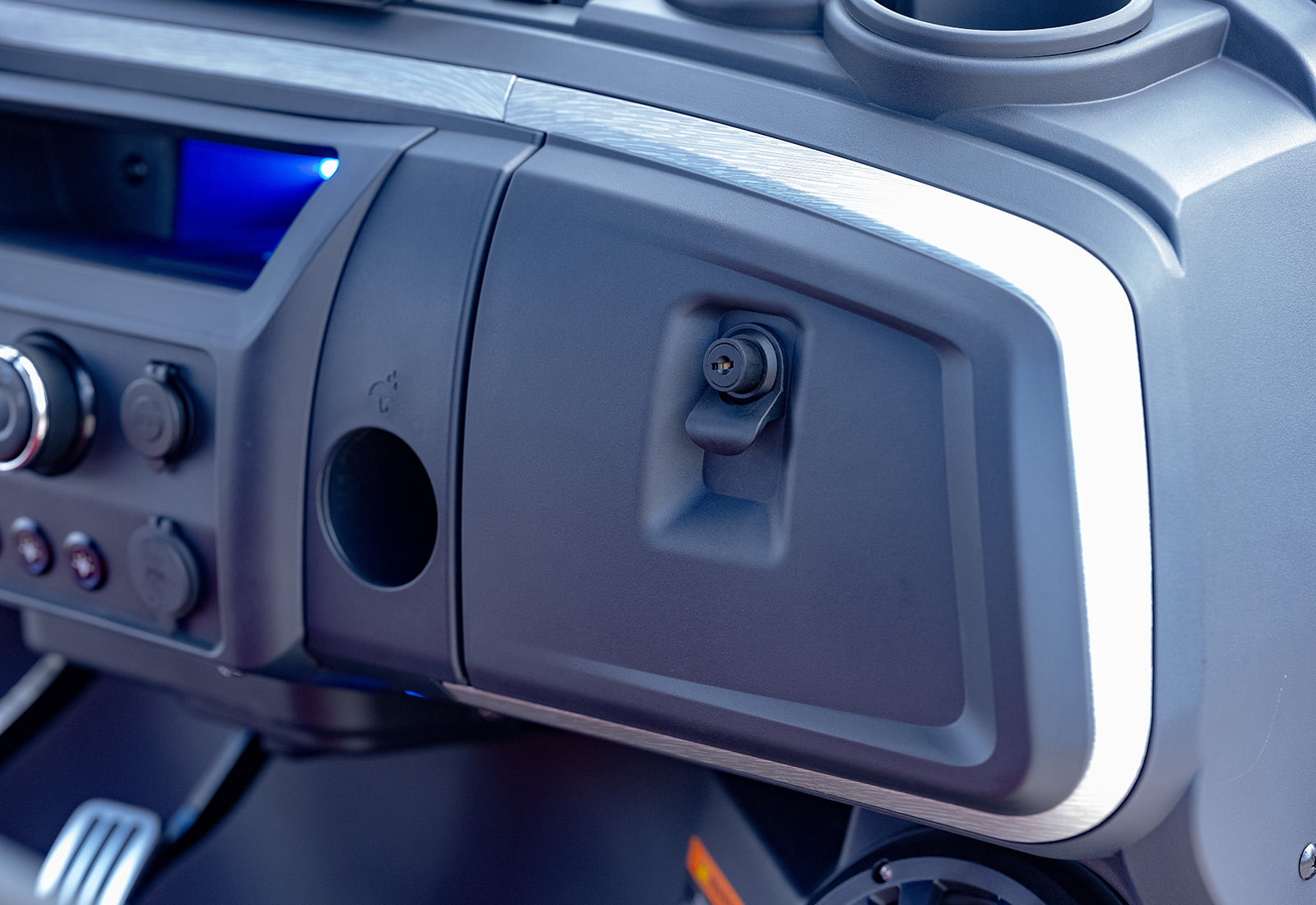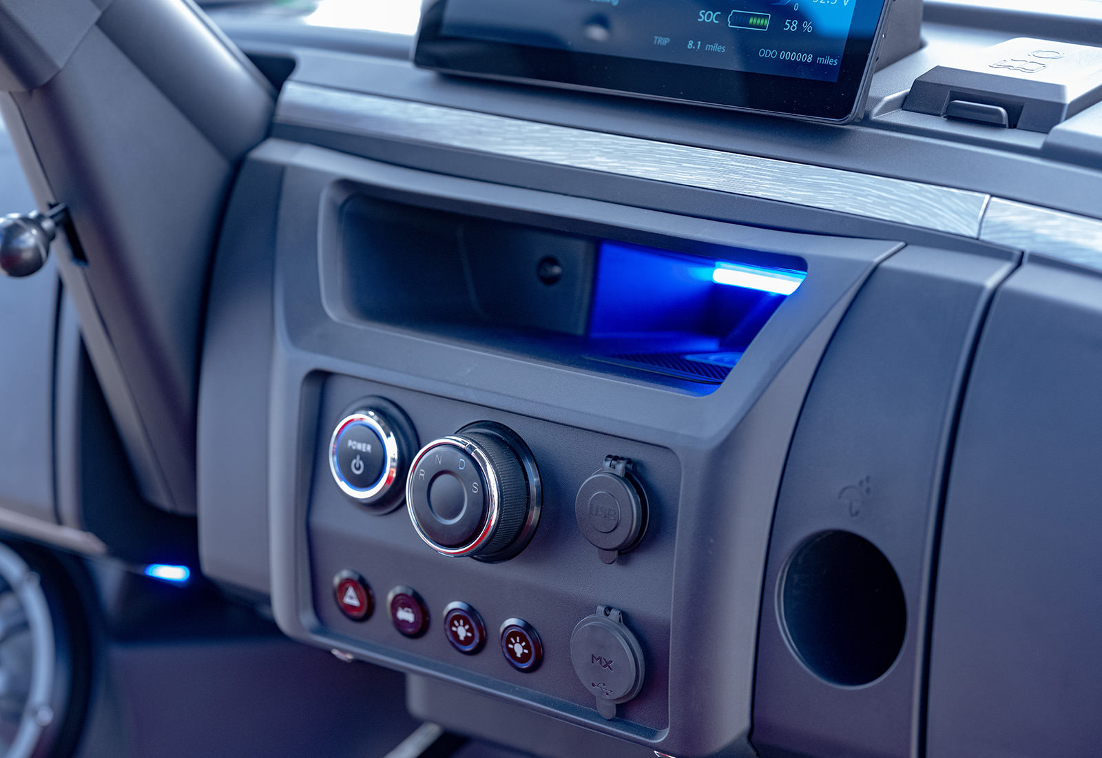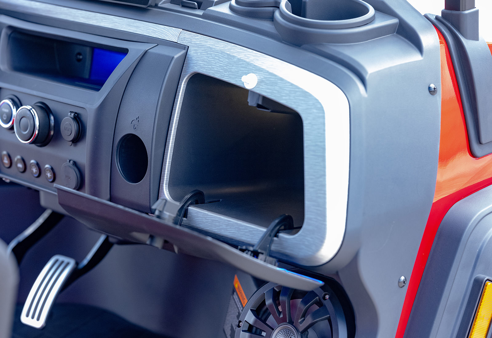 - Dash & Infotainment Locking Glove Compartments, 10.1” Digital Display Screen, Backup Camera, DOT Windshield, USB Ports & Pre-Wired 12v Switches, Horn, Digital Gauges, Lit License Plate Bracket, Built-in ECOXGear Marine Grade Sound System with 7.5A 360W Amp & Four 6.5” Speakers, Removable & Lockable Trunk in Rear, Latched and Lit Frunk,\